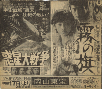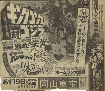 | 岡山の新聞広告スクラップ 1975〜78頃 岡山って、チラシ小僧にとっては魅力ないとこでした。東京からわざわざ買わないと 手に入らないものが多かったでした。 金もない私がそこで集めたものが、映画の割引券とこの新聞広告のスクラップなわけです。 約20数年振りに段ボールのそこから発見されましたので、特集とします。 130種ほどありますが、その中で独断でおもしろそうなものを抜粋しました。