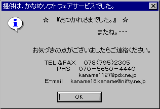 メッセージボックス #連結(&システム名,"提供は,かなめソフトウェアサービスでした。"