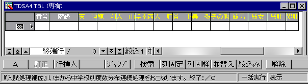 表形式編集 ガイド=#連結(&システム名,"いまから中学校別度数分布連続処理をおこないます。