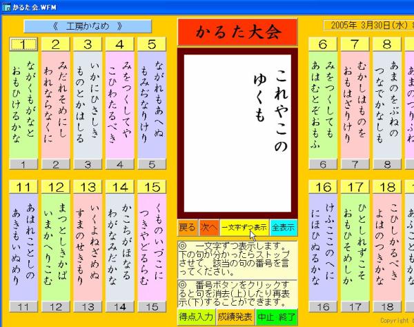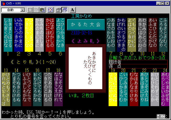 百人一首(かるた)の上の句3句を1文字づつ表示します。(『桐』v5)