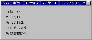 整列 年月日順,{[年]昇順,[月]昇順,[日]昇順,[食]辞書順,[番号]昇順,[CON]辞書順,[献立名]辞書順,[品目番号]昇順}