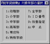 条件 (&部<10) &対象=#対応文字列("幼稚部,小学部,中学部,高等部,専攻科,特殊学級,全学部,,任意指定",&部)