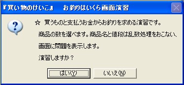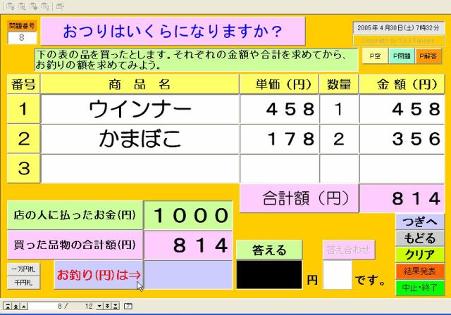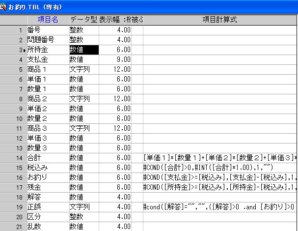 問題表示の為のデータベースとなる。[お釣り]などは項目計算式で処理し、解答の正誤判定に