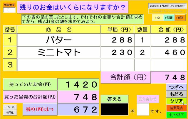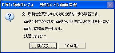 《 商品価格と所持金額を乱数を使って変えることで残金を求める問題を作る。 》