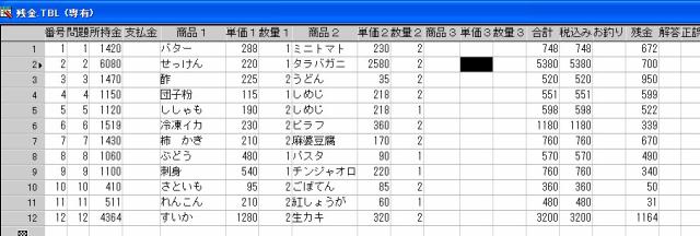 問題表示の為のデータベースとなる。[残金]などは項目計算式で処理し、解答の正誤判定に