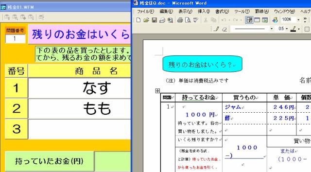 「買い物学習」の「残りのお金はいくら?」の問題を自動作成する。