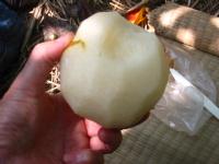 正解だった。小さいのより熟した 大きい実の方が、水分も多く甘い。 枝に近い方に青みが見られるのは 酸味が残る感じ。2つ目を頬ばって いると、持っているなしにスズメバチ が一匹飛来して乗ってしまった。 これはやばいと思って、そーっと ゴザの端においた。 しばらくの間、なしをつついていた。 |