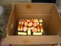 ダンボールの上蓋はガムテープで 閉じた。底蓋は外側に広げ、安定 のため、煉瓦などで押さえておく。 (燃料追加などのために、ダンボ ールの腹をカッターナイフで切り、 手が入るくらいの扉をつけて ある。) |