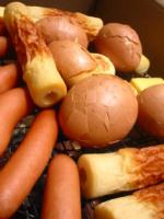 ゆで卵は殻に細かいひびを つけ、所どころ殻を除いておく。 燻製によって、ひびの所などが 変色し、面白い模様となる。 |