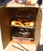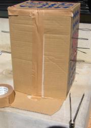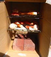ダンボールを縦置きにした結果、 底面では、幅26cm、奥行き24cm、 高さが40cmとなった。食材や 燃料は前から入れるメリットが ある。ダンボールの安定のため レンガを内側に置いた。レンガの 上に燃料をおくこと。燻製棚は2段 にできた。火からの距離は1段目が 約12cm、2段目が約22cmとなった。 |