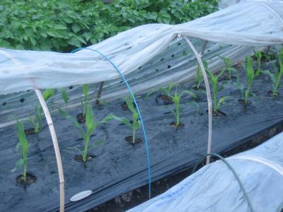 (2019年4月29日撮影) トウモロコシは、3つの畝に約100本 植えました。1本仕立てにしますが、 下方につくものは若とりし、ヤングコーン として人気です。 |
