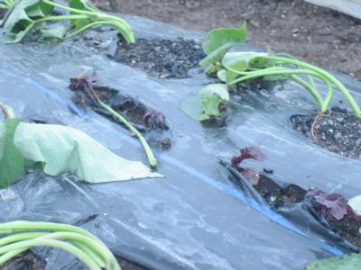 (2019年4月29日撮影) サツマイモ、4月28日に植え付けしました。 安納芋が12本、パープルスィートロードと いう紫芋が今年は16本です。6月中旬には ツルが成長しますので、そこから苗をとり ます。時期をずらして収穫でき、苗の費用 節約も兼ねています。 |