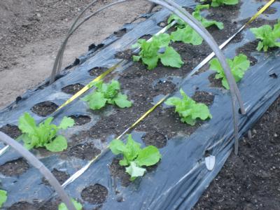 (2019年4月29日撮影) 焼肉レタスです。庭で育てていましたが、 6月中旬のサツマイモの苗がとれるまでの 間、畝が空くので、移植しました。外側から 順次成長した葉をとって、パンに挟んで 食べます。 |