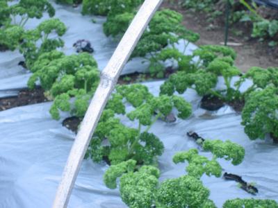 (2019年4月29日撮影) パセリ、40株植えています。花芽がつく までは収穫できます。堆肥・肥料などの 購入費用捻出に頼りになる野菜の 一つです。 |