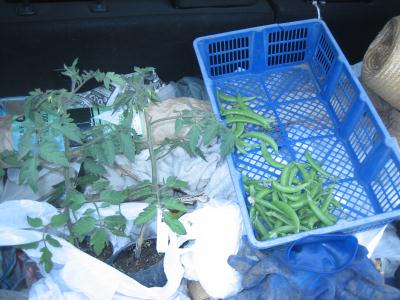 (2019年4月29日撮影) 車のトランク内。ぐちゃぐちゃです。 左は中玉トマトの苗2本。開花が近く、 庭に定植予定のもの。籠のは、スナック エンドウ。少し収穫して、近所のご自宅に 持参します。 |