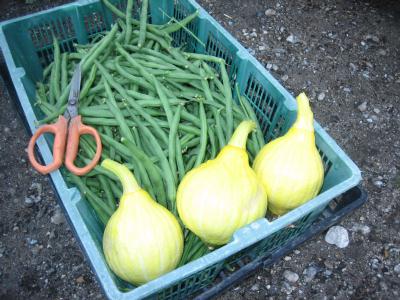 (2019年6月15日撮影) 本日収穫したインゲン豆とコリンキー コリンキー(サラダカボチャ)は初めての栽培で、初出荷です! |