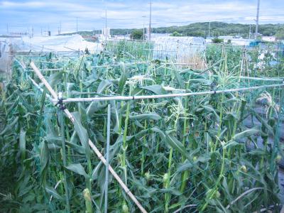 (2019年6月15日撮影) 畝C4)右パセリ、頑張っていま す。 畝C5)左トウモロコシ、ほぼ 受粉が終わり、下旬か7月上旬 の収穫になります。 若どりの「ヤングコーン」も人気です。 |