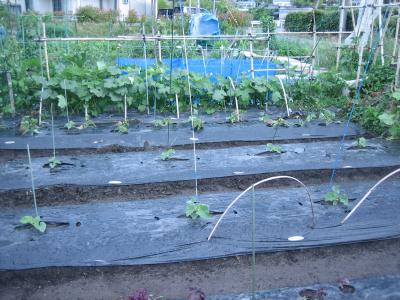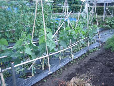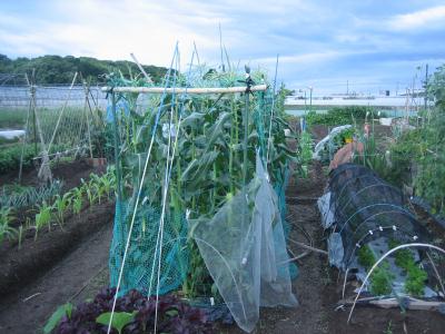 (2019年6月15日撮影) 畝A1)スナックエンドウのあとに キュウリ(「夏すずみ」)を5月27日 に定植しました。5節目までは すべて摘果します。 6月12日に第二次のキュウリの 種まきをしました。種まき時期を ずらすことで、条件が良ければ、 11月上旬まで収穫が可能です。 |