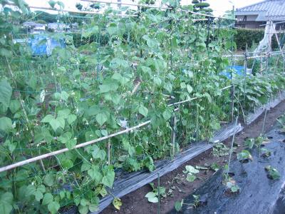 (2019年6月15日撮影) 畝C1)C3)4月下旬に定植した インゲン。先日から収穫・出荷を おこなっています。 |