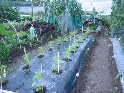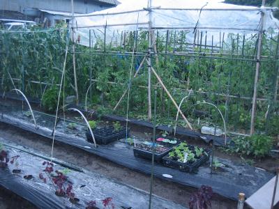 (2019年6月15日撮影) 畝A3)A4)ジャガイモのあと、バナナ マクワ。つるが伸びるまで、他の苗 つくり。 畝A5)A6)大玉トマト・ミディトマトの 収穫が間近です。花が咲いてからの 収穫は大玉で約55日、ミニで約 45日です。熟したトマトが雨に遭うと 割れるので、ビニールでドームを作り ました。 |