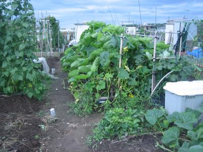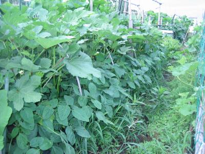 (2019年6月15日撮影) 畝E1)F2)F4)に今年初めて サラダカボチャ「コリンキー」を植え ました。 手前は、4月下旬に植付けたサツマ イモ。約50日経ちました。この頃に なると蔓がよく伸びて、ここから苗を とることができます。本体の収穫は 8月下旬から9月上旬になります。 |