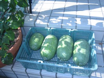 (2019年8月4日撮影) これもミニ冬瓜ですが、 「姫小雪」という種類で、 淡い薄緑色です。 |