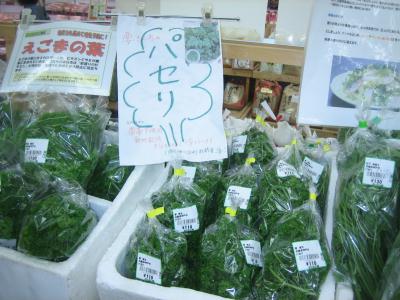 (2019年6月撮影) 再生してきたパセリを散髪して、定期的 に出荷しています。ポップがあるのとないの では、売れ行きにかなり違いがみられます。 |