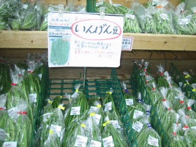 (2019年6月撮影) インゲン豆「スラットワンダー」。20cm くらいになります。 今年(2019年)の初出荷は6月14日 でした。 |