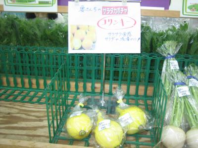 (2019年6月撮影) サラダカボチャ「コリンキー」 本日(2019年6月15日)、初出荷! 初出荷はこの3個だけ。年配のご夫妻の 主人が、ポップに注目され、1個を手にされ ました。挨拶させていただきました。 この日は2個が売れました。早速、 栽培を勧めた次女にメール報告。 |