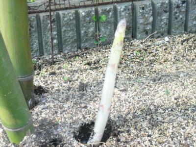 アスパラが土から顔を出すころに 竹筒を被せます。時折、空き缶を 外して穫りどきを知ります。 白いの、できるもんですね。 |