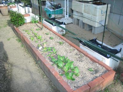 花壇のつもりが、いつの間にか野菜用 になっています。煉瓦の南縁(左側の 東西方向)より北は、春分の頃に陽が 全面にあたります。 右手の黒マルチで覆っている箱は、 ゴーヤ用です。 |