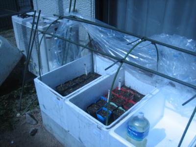 (2020.3.1撮影) 畑は自宅より低地にありますが、最低 気温は約3℃ほど低いので、4月中旬 までは自宅庭で育苗しています。 |