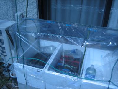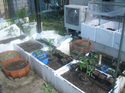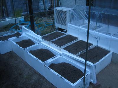 (2020.3.22撮影) 発砲スチロール箱は、ゴーヤ用に6個、 トマト用に5,6個。育苗用に6個、 その他用に数個です。数年でダメになる ので、その都度更新します。 |