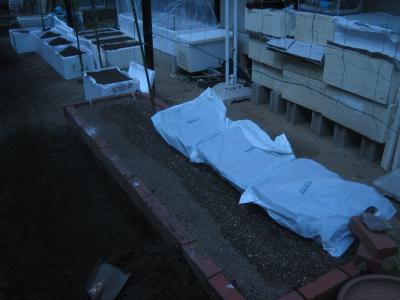 (2020.3.22撮影) 冬の間に容器をひっくり返し、土を 寒気にあてておきます。 春になる頃、篩にかけ、有機石灰・ 堆肥など混ぜて、畑と同じように土作り をしておきます。 |