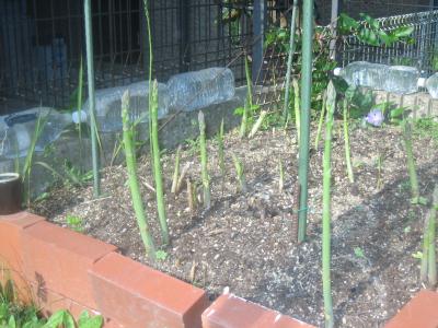 庭の南西隅にアスパラ園。 面積1u弱。栽培を始めて、 2020年で約10年になります。 |