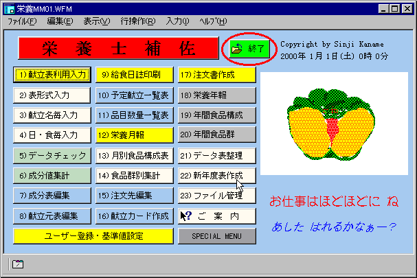 | 栄養士補佐システム | 起動初期画面 | 終 了 | |