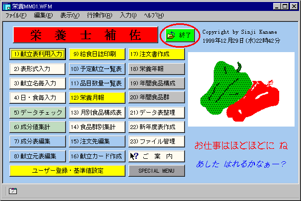 | 7) 成分表編集 | 15) 注文先編集 | 23) ファイル管理 | |