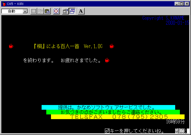 『百人一首』DOS版メニュー終了)hyakuend.html 《作品へ戻る》 《玄関へ》 ★ 下の画像は、『桐』Ver.5をDOSモードで起動し、本一括処理を使用した時の様子です。 画像取り込みのため、Windows枠に収めています。 《 終 了 》