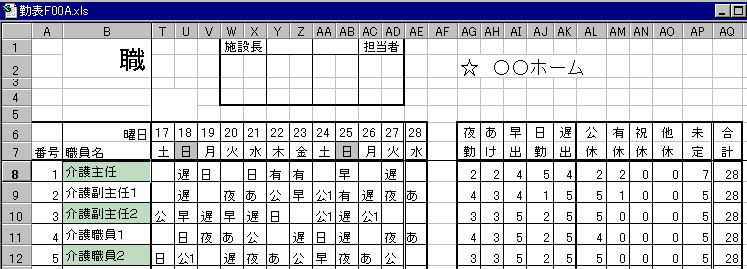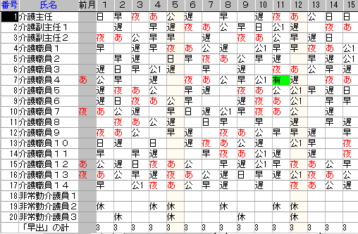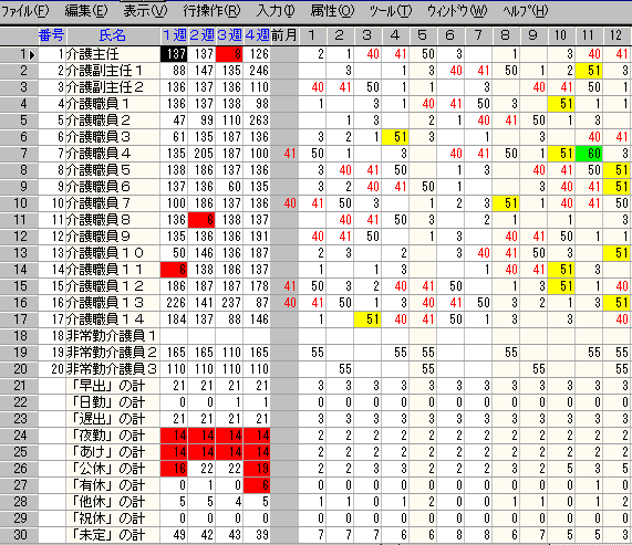 作業途中です。個人毎の勤務種類別計は表の右側に表示します。(この画面では略)