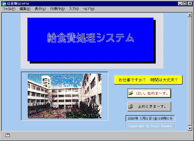 | ◎ | メインメニュー表示用 | 給食費M1 .WFM | 36KB | 各メニューの選択 | ||