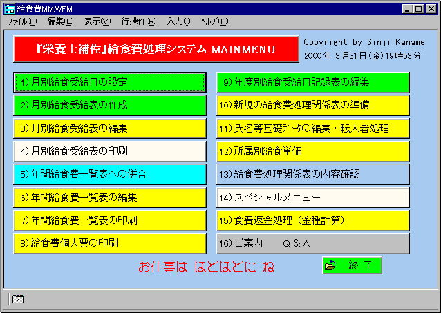 『給食費処理』メインメニュー syoku1.html 《作品へ戻る》 《玄関へ》