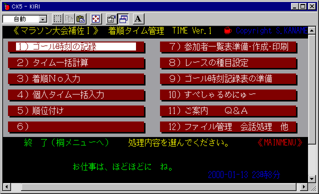 『マラソン大会補佐』DOS版メインメニューdtimm1.html 《作品へ戻る》 《玄関へ》 ★ 下の画像は、『桐』Ver.5をDOSモードで起動し、本一括処理を使用した時のメインメニューです。 画像取り込みのため、Windows枠に収めています。メニューや処理内容は、『桐』Ver.8を使用した 場合と同じです。 END of FILE 《作品へ戻る》 《玄関へ》