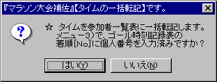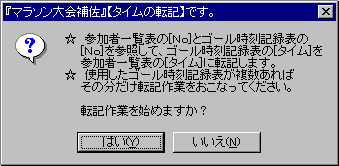 『マラソン大会補佐』メニュー4)timesm4.html 《作品へ戻る》 《玄関へ》 《個人タイム一括入力》 ★ 項目が[No]を参照して併合します。