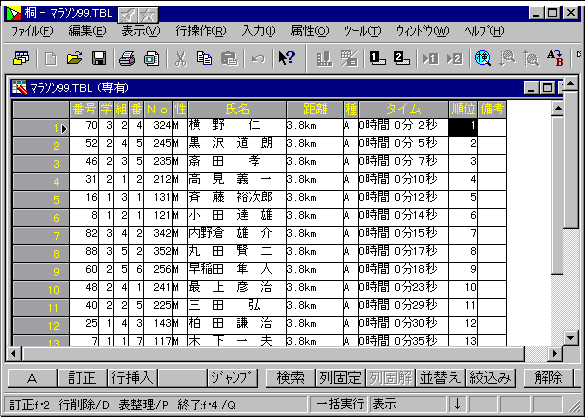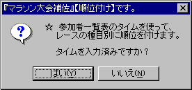 『マラソン大会補佐』メニュー5)timesm5.html 《作品へ戻る》 《玄関へ》 《順位付け》 ★ 種目別にタイムを使って順位を付けたところです。