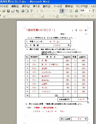 ・ 食料品一覧表(商品表)は、[番号],[区分],[商品名],[単価]から成るプリントを配布しておきます。