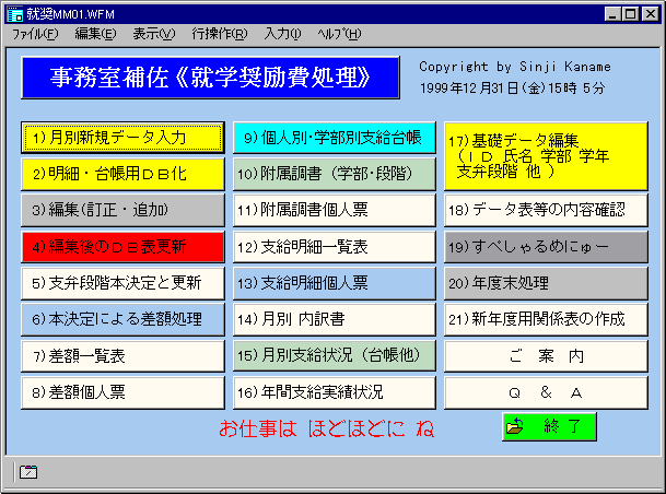 | 1) 月別新規データ入力 | 9) 学部別・個人別支給台帳 | 17) 基礎データ編集 |