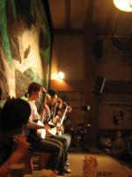 ![]() 夕食は、津軽三味線ライブの 「山唄」で。奏者がバイトで 料理を運んでくれました。 演奏の出番になると、注文が 中断されます。だれも文句を 言いません。 |
