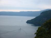 十和田中湖が眼下に望める瞰湖台。 静かな湖面を遊覧船が・・・ |