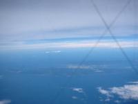 空路で帰ることができるか、前日から 心配でしたが、台風が日本海を北上 する間に、大阪に飛ぶことができまし た。佐渡が島がよく見えました。 (×の線は機体窓の傷です) |