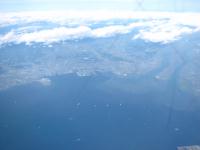 ぐんぐんと高度を下げながら生駒 山脈を西に越えると、大阪府の 町並みが迫ります。「新大阪駅の 上を通過するやろうけど、うすさい やろうな」 |